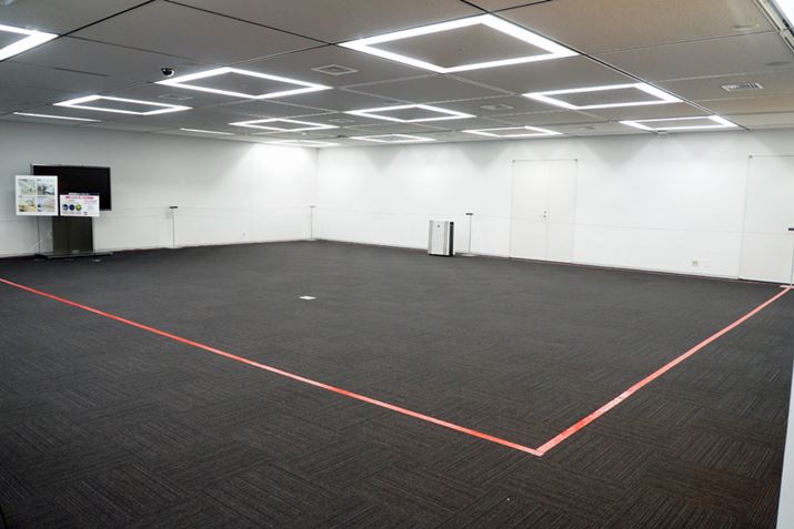 「FP-140EX」の適用床面積〜65畳は、このぐらいの広さ(赤いテープで囲まれた部分)。リビングだけでなく、オフィスなどでの利用も想定されている
