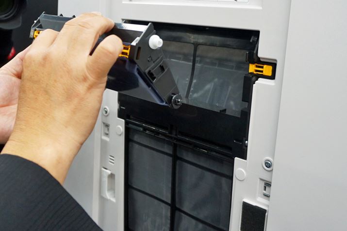 このように高い集じん性能を有していても、フィルターが目詰まりすると能力はダウンする。集じんフィルターと脱臭フィルターは約2年間交換不要だが、その手前にあるプレフィルターは定期的な手入れが必要。手入れ自体は簡単なものだが、つい後回しになりがちだ。そんな状況を防ぐために、「FP-140EX」には自動お掃除機能が搭載された。