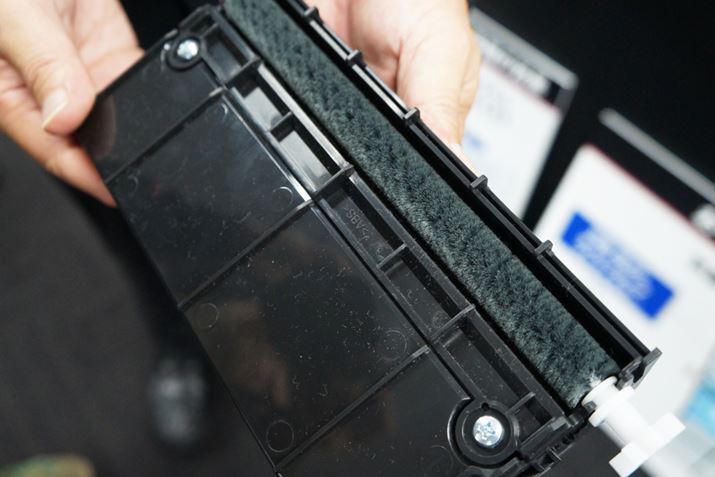 ダストボックスの裏側には掃除機のヘッドにあるようなブラシが装備されており、プレフィルターを上下に動かすことでフィルター表面に付いたホコリが取り除かれる