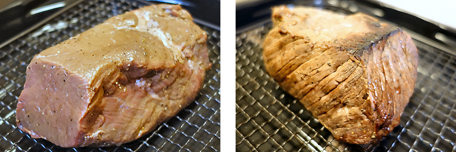 我が家でまず最初に調理したのは「ローストビーフ」。ローストビーフは、中心温度が54〜65℃以内になるように温度を調整する必要があり、意外に失敗しやすい料理だ。温度が低ければ中心は生になり、ローストビーフというより「牛肉のタタキ」になってしまう。反対に温度が高すぎると、パサついて固い肉になってしまう。基本的にオーブンでローストビーフを調理する場合は、肉汁が逃げないようにオーブン調理前に肉をフライパンで焼く作業を行う。しかし、ET-YA30付属のレシピでは、塩コショウをした肉を、オーブンに入れ「ローストビーフ」メニューを選択するだけでOK。完成したローストビーフは、中がしっとりとジューシーで、まさにお手本のような出来栄えだった。