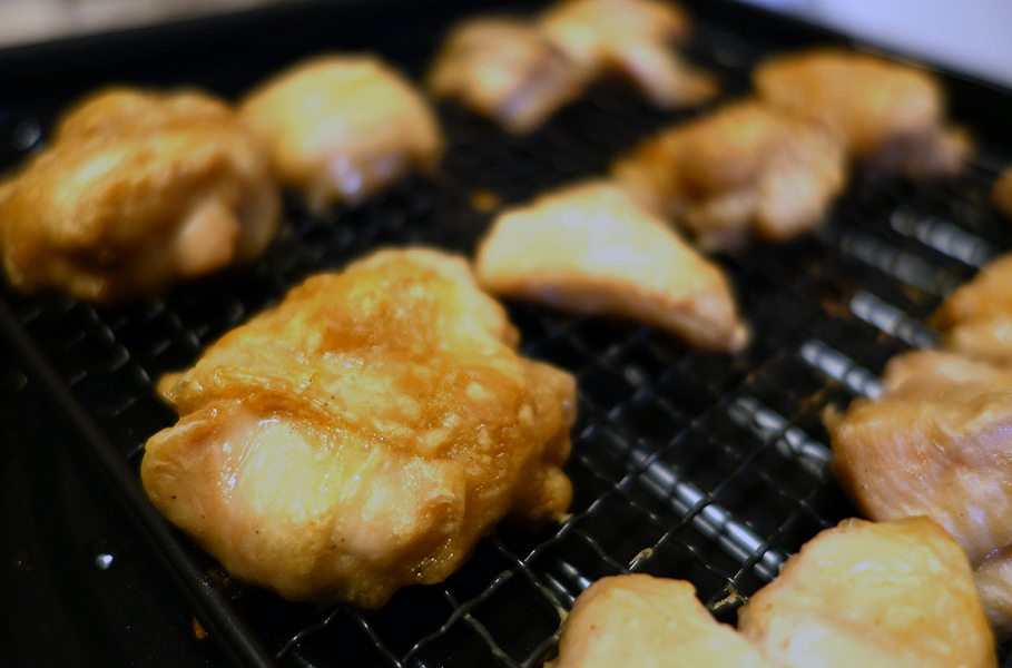 いつもの要領で作った物を並べて焼くだけ。から揚げと比較すると少々焼きムラはあったものの、非常にクリスピーな仕上がり!