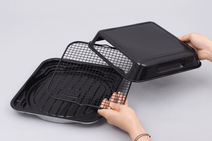 最初にカバーを見たときは「洗いものが増えて面倒だな」と思った筆者だが、実際に調理をしてみるとノンフライ調理時はこのカバーが非常によい仕事をしてくれた。コンベクションの熱風が狭いカバー内でまんべんなく対流するためか、ノンフライ調理をした食材の揚げムラが非常に少ないのだ! 筆者は今までさまざまなノンフライオーブンを使用してきたが、鶏のから揚げがここまで焼きムラなくカリッと揚がるのには驚いた。