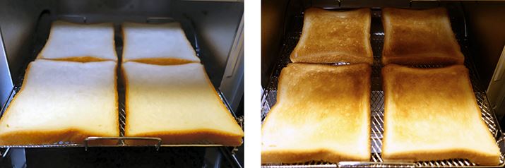 強い火力で、トーストは最大4枚が約5分で焼けて便利(左がトースト前、右がトースト後)。 冷凍パンのトーストメニューもある