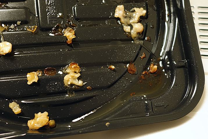 油は使っていないのに、焼き上がり後は大量の脂分がトレーに溜まっていた。この分だけカロリーオフできていると思うとうれしい