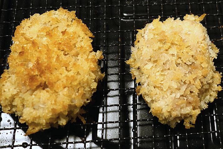 ちなみに、左が炒りパン粉、右が普通のパン粉を使用して作ったとんかつ。普通のパン粉でもサクッとした食感でおいしいのだが、焦げ目の香ばしさやクリスピーさが少なく、味は一段落ちる感じ