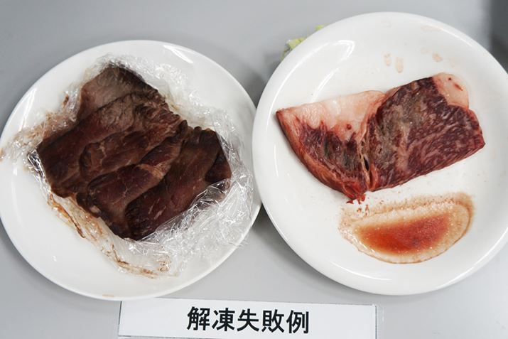 このように外観からはパーシャルか冷凍かは見当もつかないが、食べるとその差は明確! 冷凍保存した肉はパサパサとした食感で、噛んでいても引っかかりを感じた。いっぽうパーシャル保存した肉は柔らかく、噛むとおいしさがギューっと出てくる(つまりは旨味が残っているということかも!?)。ちなみに、赤いシールの付いているほうがパーシャル保存だ。