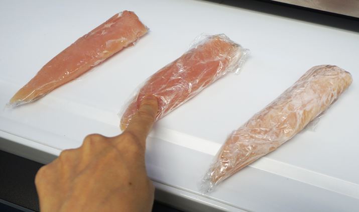 中央にあるのがパーシャル保存されたささみ。一見、冷蔵室で保冷されていた左のささみと同じに見えるが、触ってみると表面がわずかに凍っていることを感じる。パーシャル保存は冷凍(右)のようにカチカチにならないので、解凍せずに包丁で切ったり調理できるのも魅力だ