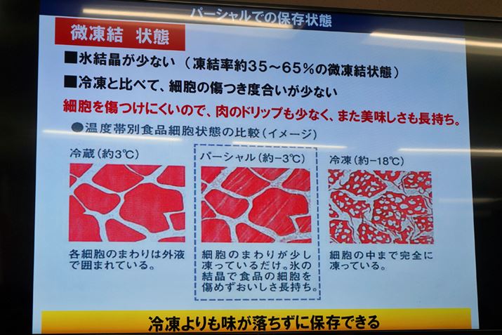 冷蔵、パーシャル、冷凍した際に食材の細胞がどのようになるのかを図解したもの。パーシャルはほぼ冷蔵と同じような状態で細胞が維持できている。冷凍したものは細胞の中まで凍ってしまい、細胞が壊されてしまう