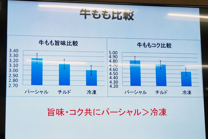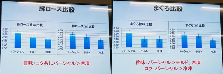試食したものと同じように、それぞれの部屋で7日間保存した後の味覚調査の結果。冷凍よりもチルドのほうが旨味やコクは高いが、パーシャルはさらに高い数値に。ちなみに、0.2以上の数値差が出ないと有意差にはならない