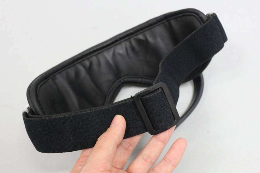 エアバッグ、バイブレーター、ヒーターはマスクに内蔵されている。マスクの内側はやわらかいナイロン素材。ベルトはゴム製なので、アイマスクのように頭からかぶって装着可能だ