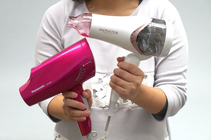 向かって右がモンスターKHD-W702、左がナノケア EH-NA97。モンスターKHD-W702がやや大きいものの、持った印象は人によって異なりました