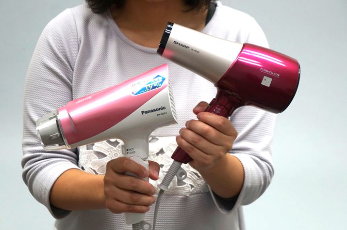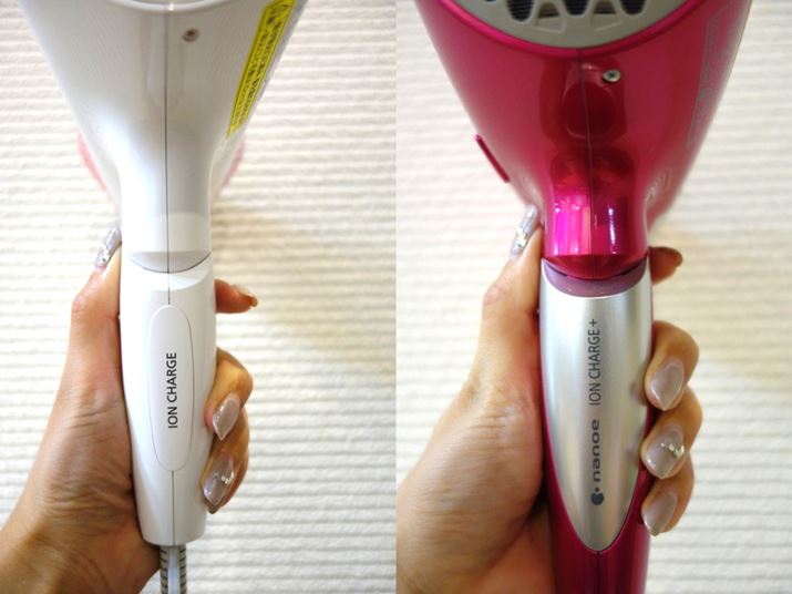 左がイオニティ EH-NE67、右がナノケア EH-NA97。ハンドル部を握って乾かすだけでイオンを髪に吸着させます