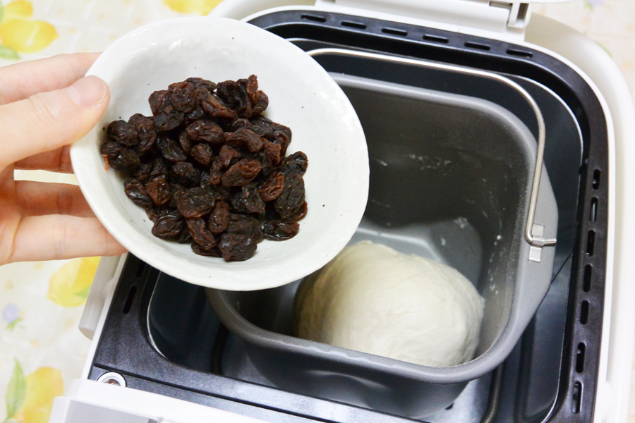 材料を攪拌して生地をねる途中で、混ぜ込みたい具材を入れる。運転開始から約1時間後にブザーが鳴るので、そのタイミングで投入