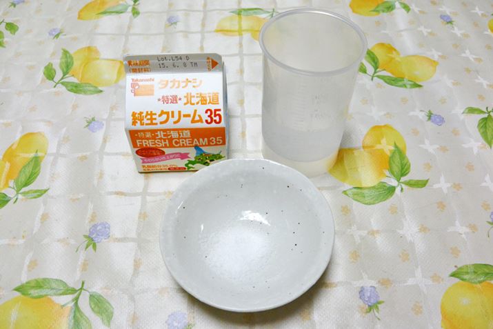 材料は、生クリーム(195〜200ml)と水(100ml)。塩(6g)は好みで入れる入れないが選べ、無塩バターにすることもできる