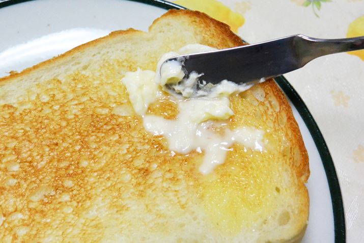 でも、バターを冷蔵庫に入れる前にできたてを食してみてほしい。やわらかくなめらかなので、写真のようなトーストした熱々のパンに塗らなくてもトロトロ。市販されているバターを常温で戻したものとは別格の口どけとおいしさに感動した