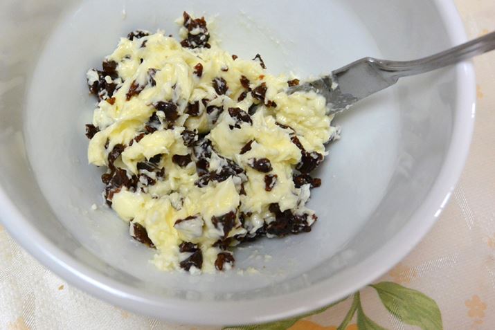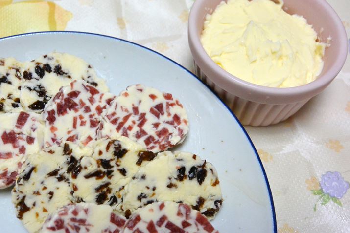 刻んだレーズンを、作ったバターに投入して混ぜる。この時、レーズンを事前にラムに浸しておけば、香り豊かなラムレーズンバターにすることも可能