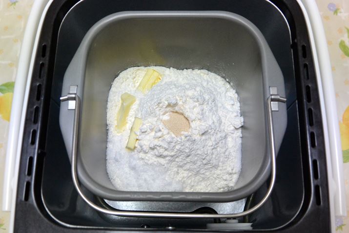 無塩/有塩バターのどちらを作ったかで塩の量は変わるが、その他の材料は普通の食パンと同量。「HBK-100」にはドライイーストが自動投入される機能はないため、投入した材料の一番上に窪みを作ってセットしておく