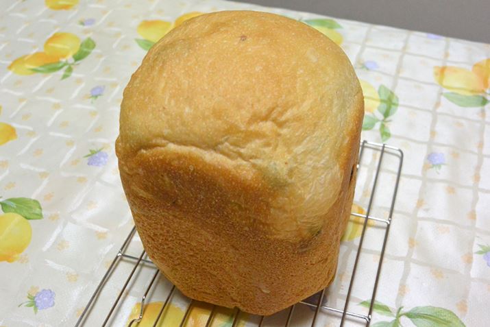 レーズンパンが焼き上がった。上で作った食パンよりも天面が濃いキツネ色になって、見栄えはいい。レーズン以外の材料の分量は同じなので、室温などの状況によって焼き色に差が出るのかも