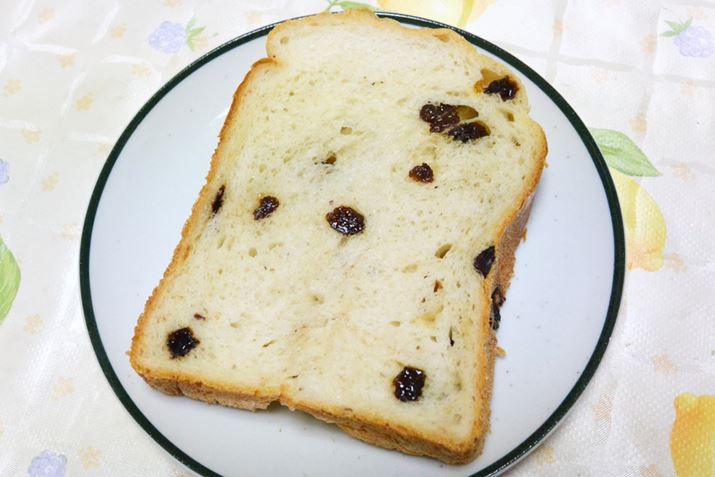 カットしてみると、いい感じでレーズンが分散して練り込まれている。具材入りパンを作ると攪拌で細かく砕かれてしまうこともあるが、「HBK-100」で作ったものはレーズンの原型が保持されジューシーさも残っていた