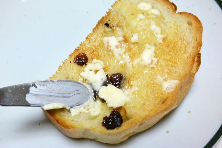冷蔵庫に入れておいたバターと冷凍保存していたレーズン食パンを、作った2日後に食べてもおいしさは健在。1度に食べ切らずに冷凍しておいても、トーストすればパンはフワフワ&サクサク!