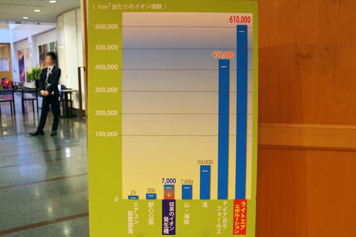 従来の電気式空気清浄機から発生されるマイナスイオンの量は1p³あたり約7,000個なのに対し、「イオンフロー50」は約61万個