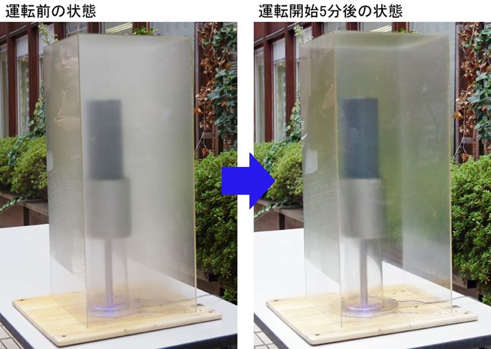 では、実際に空気の汚れが除去できるのかを検証。煙が充満するボックス内は、キレイになるのだろうか。