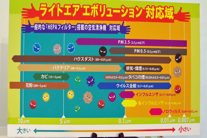 HEPAフィルター搭載の空気清浄機では、ウイルスの大半がキャッチできず。自動車の排気ガスや煙に含まれる煤塵も、捕集することができない