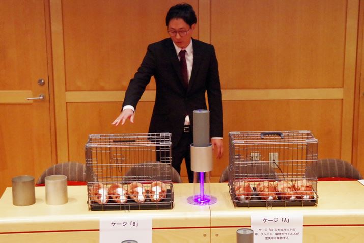 実験の様子をイメージしたケージを前に、ライトエアのジュリアン・リー氏が実験結果を報告。接触しなくてもウイルスはくしゃみや咳によって空気中に拡散され、ほかの個体に感染してしまう
