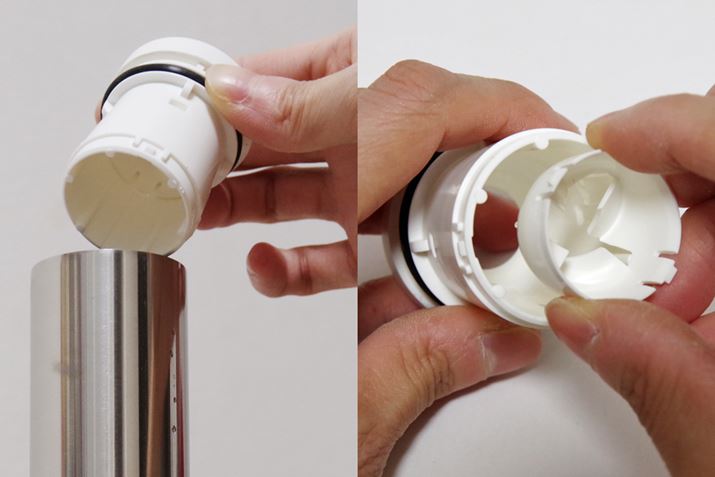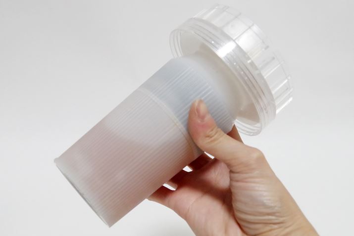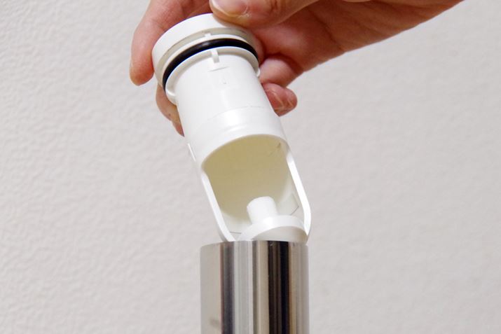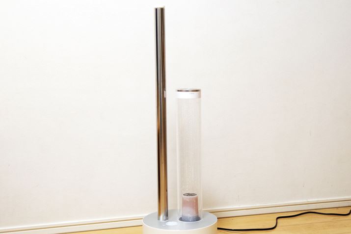 クリアな筒が給水タンクで、銀色の筒がミストを放出するダクト。給水タンクの中に見えるものが、除菌のためのカートリッジだ