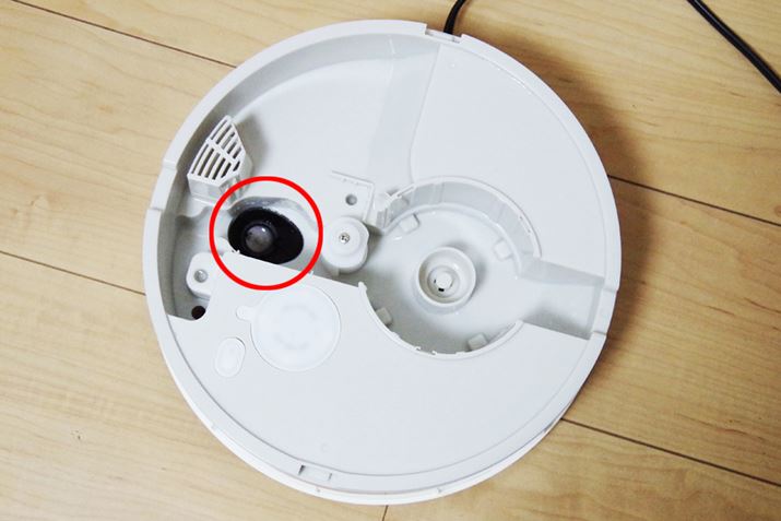 本体内には水路が設けられており、赤い囲み部分で起こる超音波振動によりミストとなる。そのミストをファンでダスト上部に誘導し、部屋中に噴出