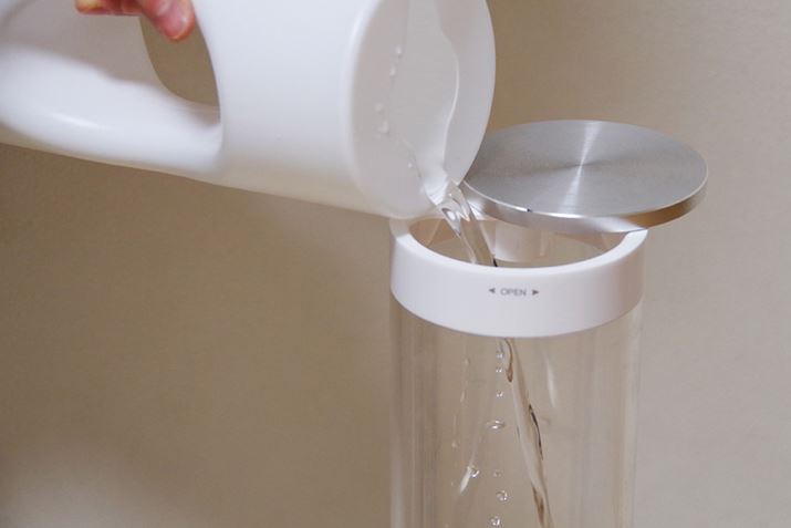 給水タンクのフタを開けて、水を注ぐ。給水カップが付属しているので、こぼさずに入れることができた。一度に入れることができる最大量は2.2L