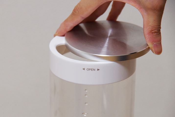 実は、給水タンクにも“和”の演出が! 水平にスライドするフタは、茶筒のようななめらかな開閉を意識したという。正直、茶筒のように引いて開ける仕様ではないので共通点は見当たらない。だが、一般的な給水タンクのようにフタをギュッと回して開け閉めすることなくできる動作で、茶筒を開けるように手間なくスムーズという感覚を意識したようだ