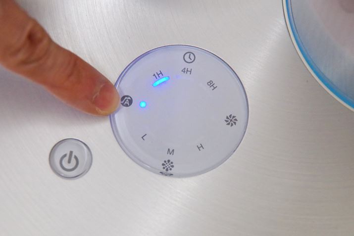 選択された運転モードが青く点灯する。ちなみに写真は、「自動運転で加湿され、1時間後に停止する」設定。運転停止タイマーは、1・4・8時間が選べる