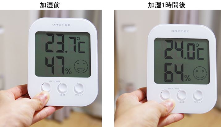 本来は自動運転で問題ないのだが、筆者が使用した期間は湿度が高めだったこともあり「急速運転」で加湿器のパワーを測定してみた。運転前は室温23.7℃、湿度47%だった部屋が、運転開始から約30分で56%に上昇。さらに、1時間後には64%に! ちなみに測定は、加湿器から1.5mほど離れた場所で行った