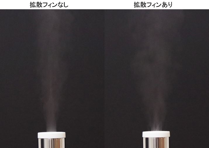 拡散フィンを装着しない場合、ミストは細長く垂直に高く噴出。いっぽう、フィンを装備すると幅が広いミストが放出された。加湿器の周辺部を重点的加湿したい時にはフィンを付け、広範囲にミストを届けたいならフィンを外すといい