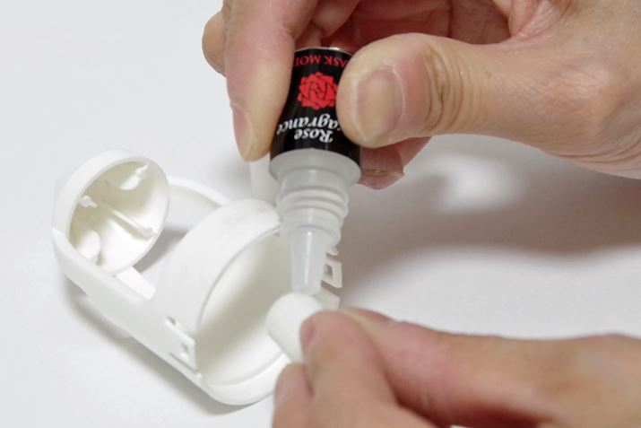 付属の給水芯にアロマオイルを染み込ませ、アロマトレーにセット。ちなみに、アロマオイルは同社が開発したものを使用するように推奨されている(別売)。※写真のアロマオイルはサンプル品です