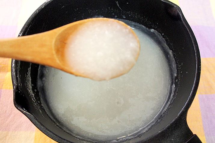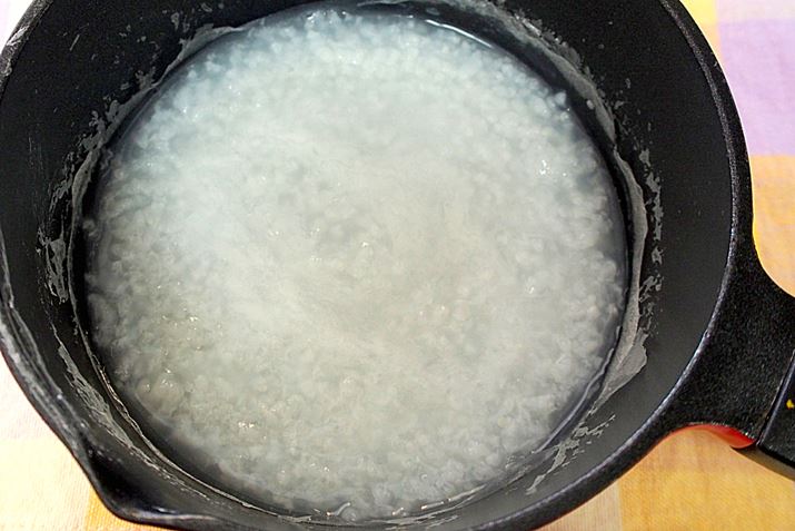 ご飯を鍋で煮込んで作った10倍がゆ(もちろん「おかゆモード」のある炊飯器でつくってもOK)。まだご飯の粒がかなり残っている状態