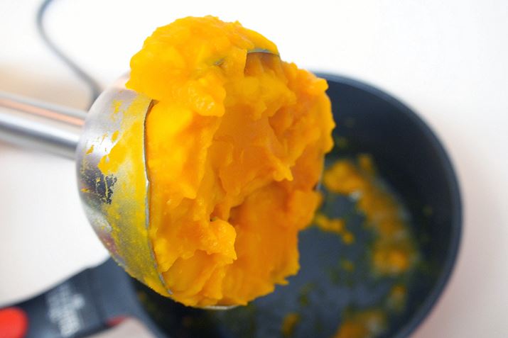 フードの中のかぼちゃを回収し、改めてお湯を多めに足してブレンダーにかけたら、今度はよりなめらかなペースト状に。美味しそうです