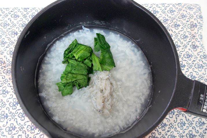 熱湯に浸けたあと再び熱湯を回しかけたしらすと、電子レンジでチンしてやわらかくした小松菜(葉先)をおかゆに投入