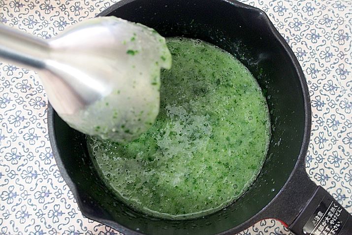 鍋の中にハンドブレンダーを入れ、ガーッと高速回転。1分ほどで粒がほとんどなくなり、ペースト状に。煮込み続けてこのトロトロ状態にするには、難しいだけでなく時間がかかります