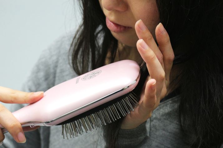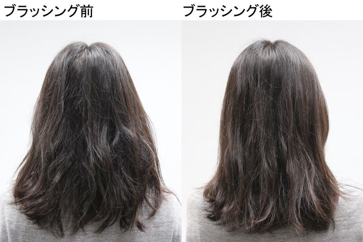ブラッシングに使用する際は、電源を入れた状態で通常のブラシと同様に髪の毛をやさしく梳いていくだけ。ただ、濡れた髪や整髪剤の付いた髪には使用できないので注意しましょう。起きてそのままの絡まりだらけの髪をブラッシングしたところ、あっという間に絡まりと広がりが抑えられました。