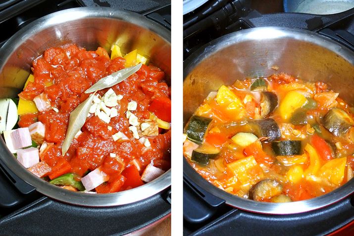 材料を入れてスタートボタンを押すだけで、ラタトイュが完成(写真右)。攪拌されると食材が崩れるのでは? と心配されるかもしれないが、煮崩れはなし。12時間後まで対応する「予約調理」や最大12時間の「保温」もできる