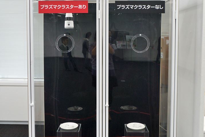 発表会で用意されていた消臭力の検証装置。ニオワンLEDプラスが装着されたボックスは、ニンニクのニオイをまったく感じることはないほど消臭されていた