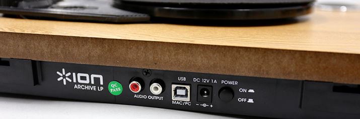 標準的なラインアウト出力端子(RCA端子)が装備されており、ほかのコンポやスピーカーに繋いで楽しむことも。注目は、USB端子。このあたりが、昔のレコードプレーヤーとは違うところ。PCやiPhoneなど(iOS搭載端末)にデジタル出力が可能