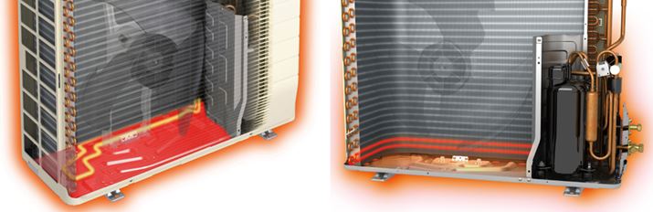 仕組みはメーカーにより異なるが、ダイキンの場合は「ドレンパン」と呼ばれる室外機の底の水受け皿の部分にヒーターを装備している。さらに、水滴が付きやすい最下部の冷媒用のパイプ部分に温度が高めの冷媒を循環させることで熱交換器に霜が付くのを防止