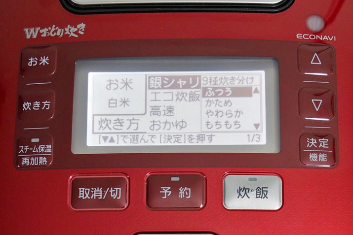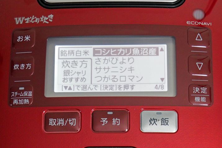 まず最初に確かめるのは、「銘柄白米・銀シャリ(おすすめ)」で炊いたごはん。この味を基準にして、「銀シャリ(よりもちもち)」と「銀シャリ(よりしゃっきり)」、そして、「エコ炊飯」の4種類をそれぞれ数回炊いて確かめてみた。