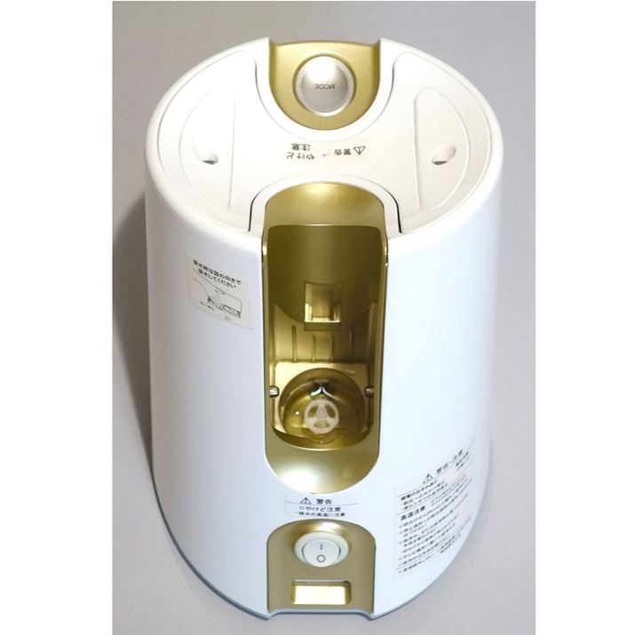 本体形状はやや斜めになった筒型で、アクセントにゴールド色が配置された高級感のあるデザイン。本体裏手に主電源スイッチ、そして本体手前側に操作ボタンをひとつ配置しており、基本的な操作は手前のボタンだけで行えるシンプルな設計になっています。