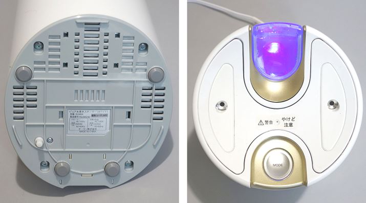 本体底面(写真左)には、持ち上げたり点灯すると自動的にスイッチが切れる転倒感知スイッチを配置した安心設計。本体天面(写真右)の左右の穴から温スチームが、中心の小さな穴からは冷風が吹き出すようになっています