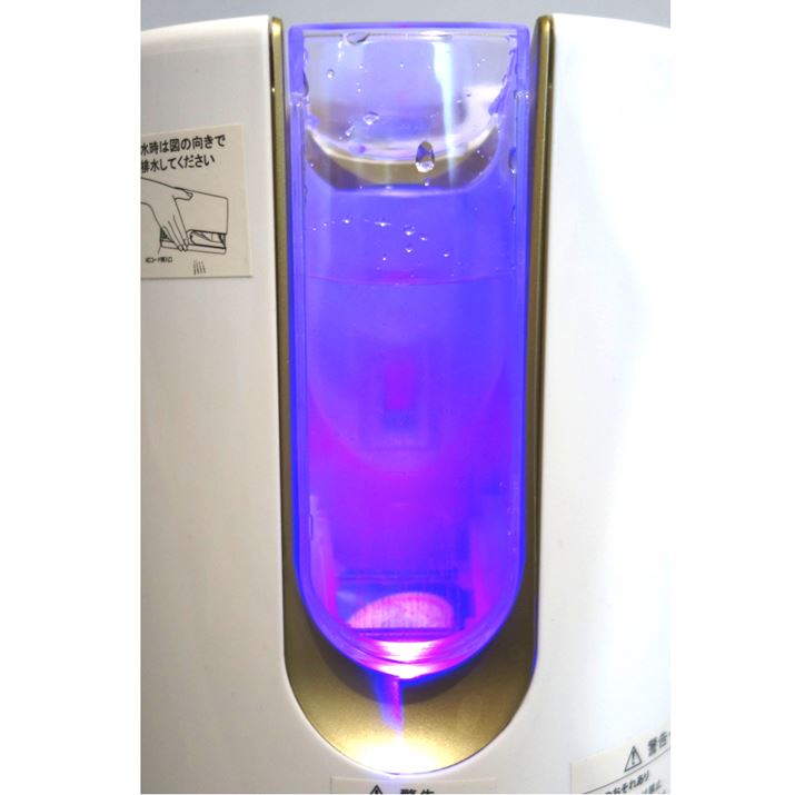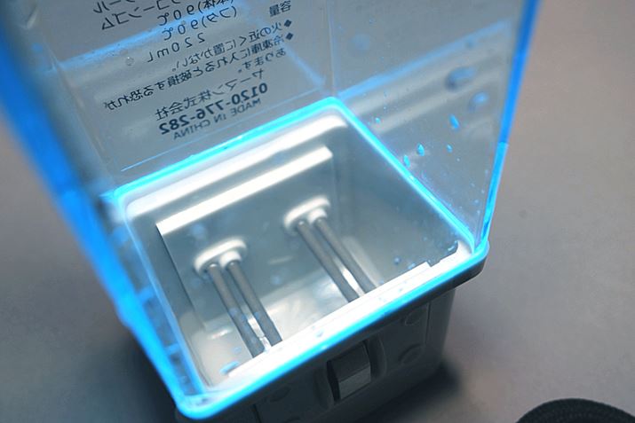 スタートすると、タンクが青色に光り水素の生成を開始。電極から細かな泡が発生し、水全体が気泡で白濁して見えます