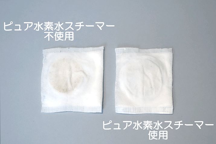 クレンジング時にピュア水素スチーマーを使用しなかったほうは、コットンに色がついています。化粧品がちゃんと落ちきっていなかったことがわかります